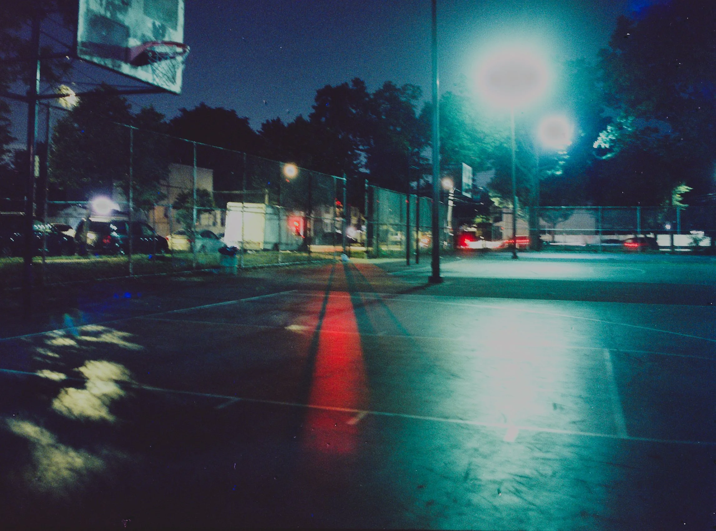 Empty outdoor basketball court at night with bright overhead lights reflecting on the surface, surrounded by a fence and parked cars in the background.