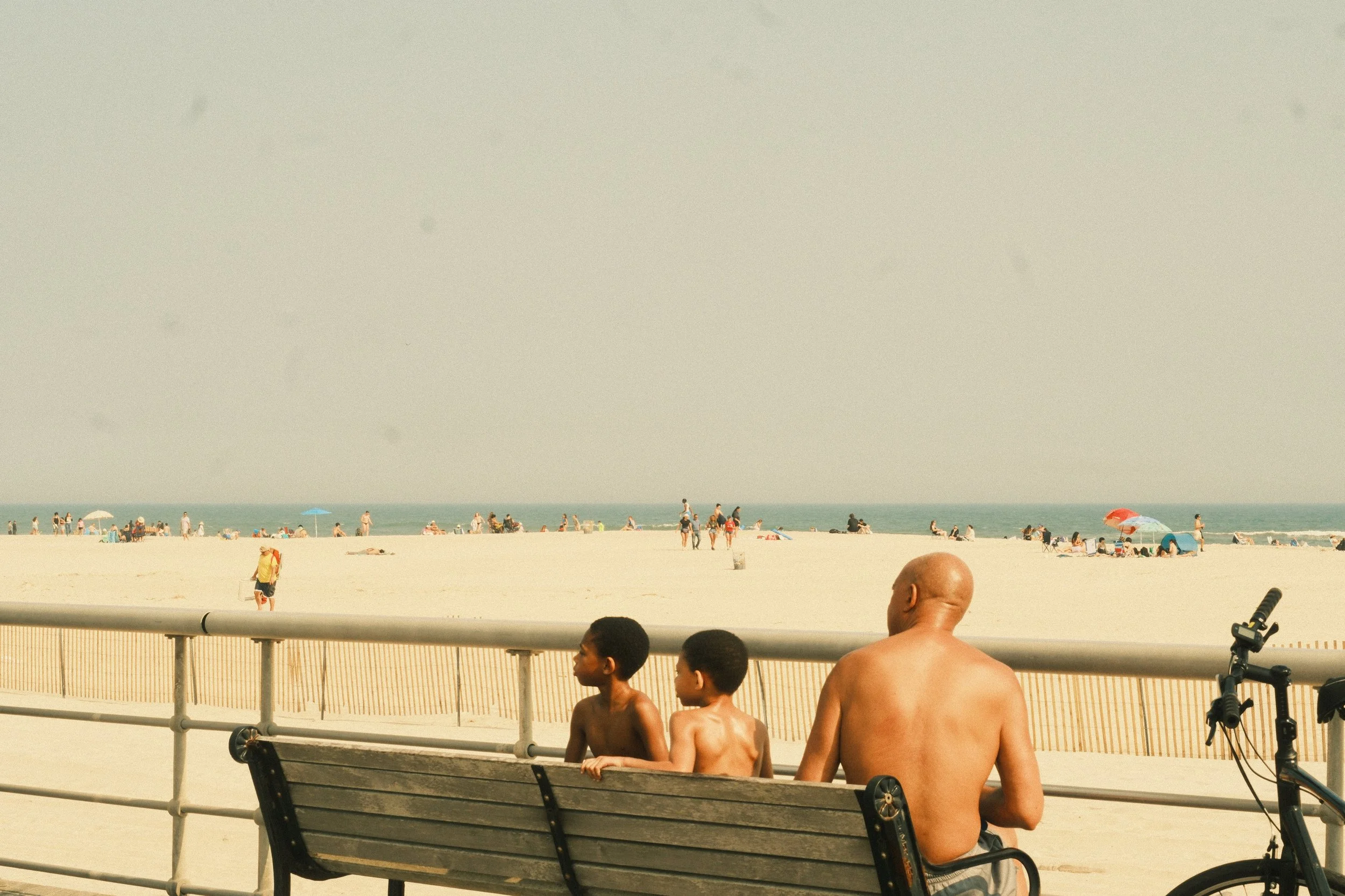 An older man and two boys sitting on a park bench near a beach, with the beach and ocean in the background, and beach umbrellas and people in the distance.