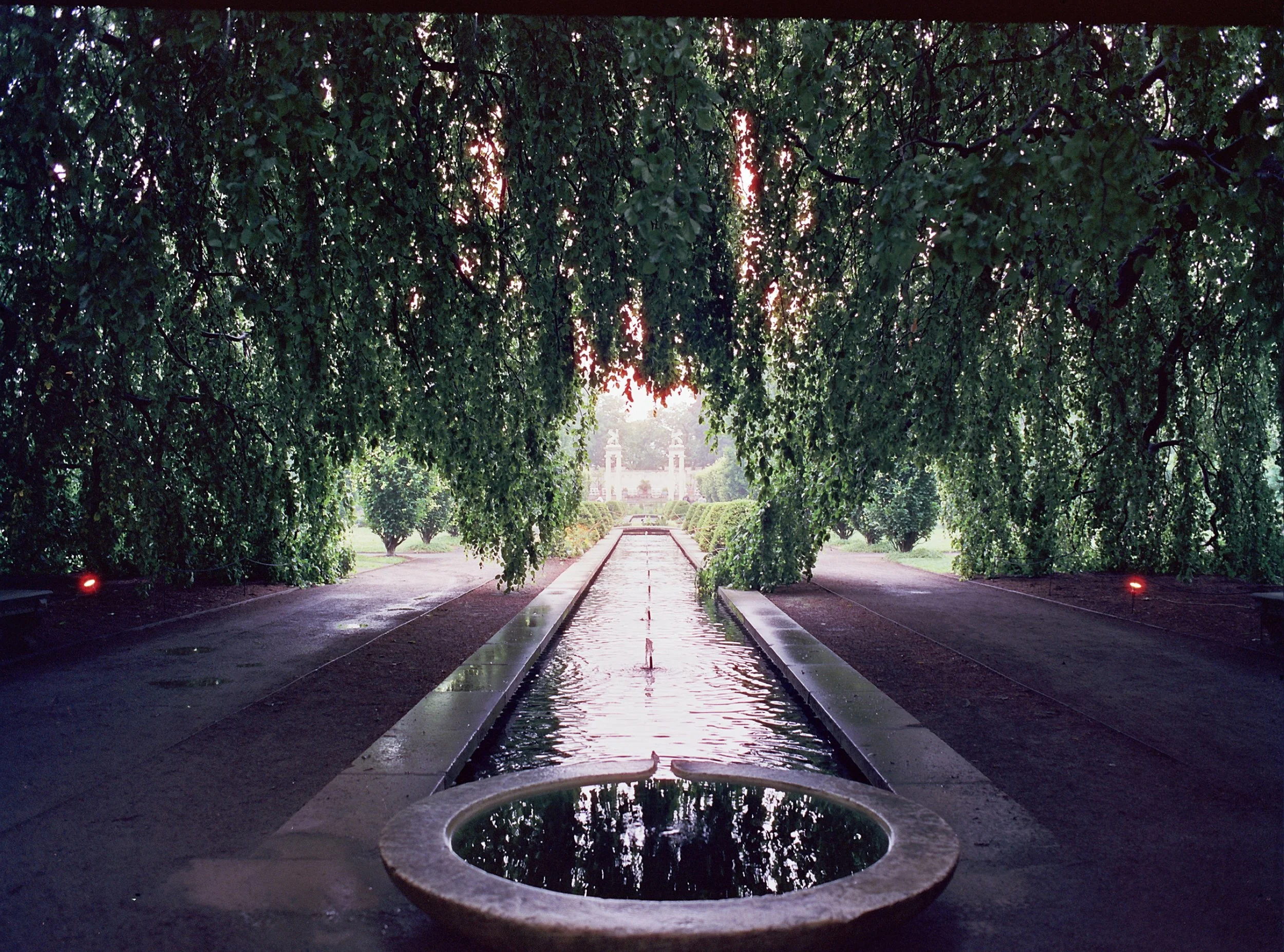 A park with a stone fountain and a water channel surrounded by trees and greenery, with a building visible in the distance. View fullsize