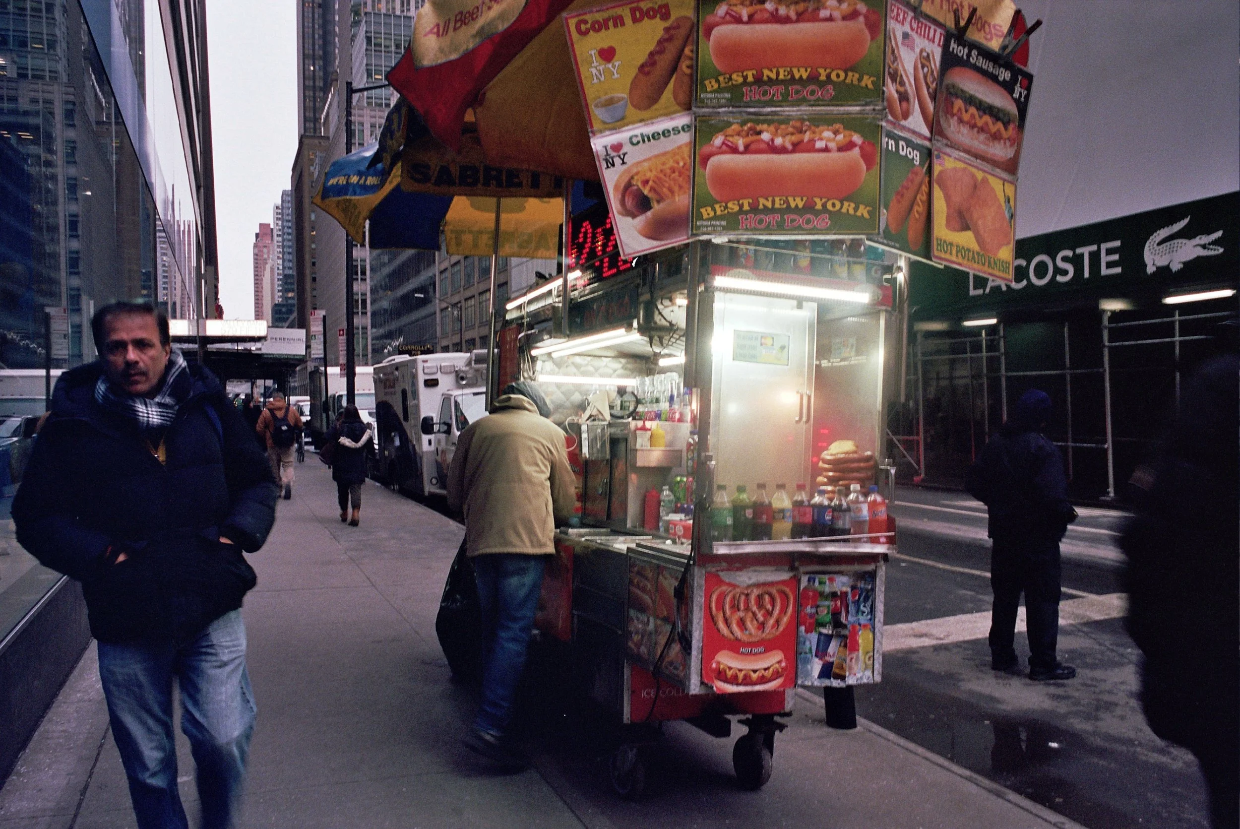 A street scene in New York City with a hot dog stand on the sidewalk, several pedestrians walking by, and tall buildings in the background. The stand displays various signs advertising hot dogs, corn dogs, cheeseburgers, and other fast food.