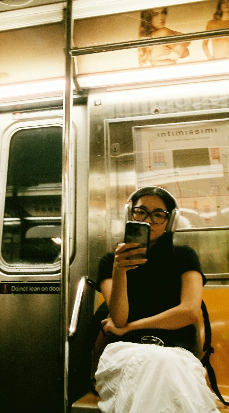 A woman with glasses and headphones taking a selfie in a subway train, sitting with her arms crossed and a white cloth on her lap. She is wearing a black shirt and appears to be looking at her phone's screen.