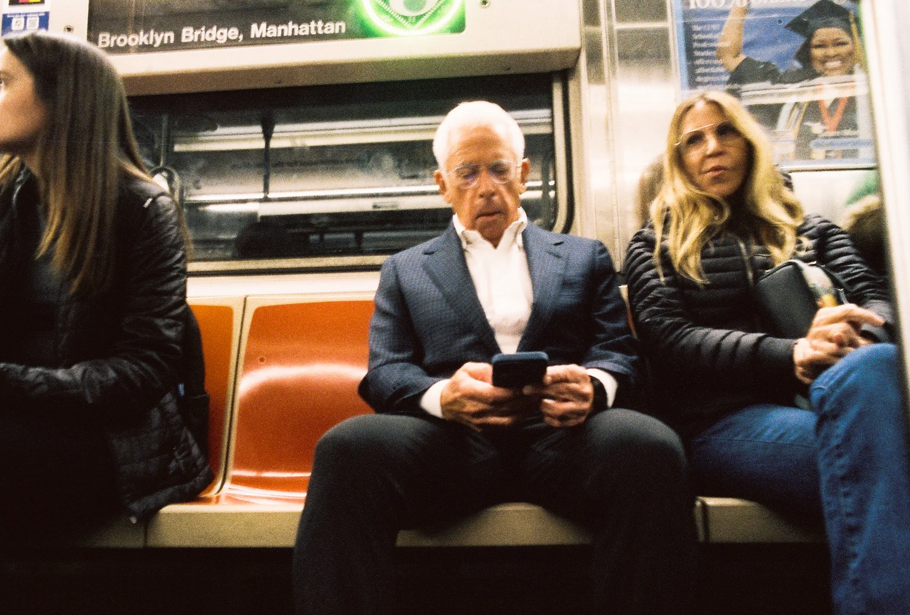 A man in a suit and glasses sitting on a subway, looking at his phone, with a woman in sunglasses and a black jacket sitting beside him, holding a purse. Other passengers are partially visible, and a sign reads 'Brooklyn Bridge, Manhattan.'