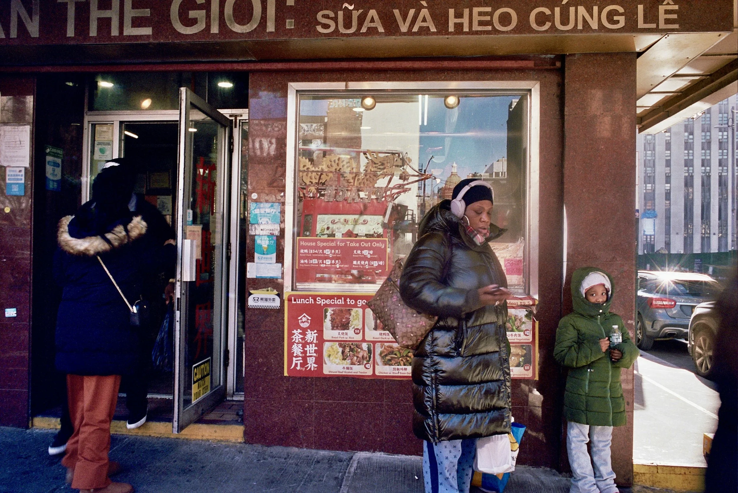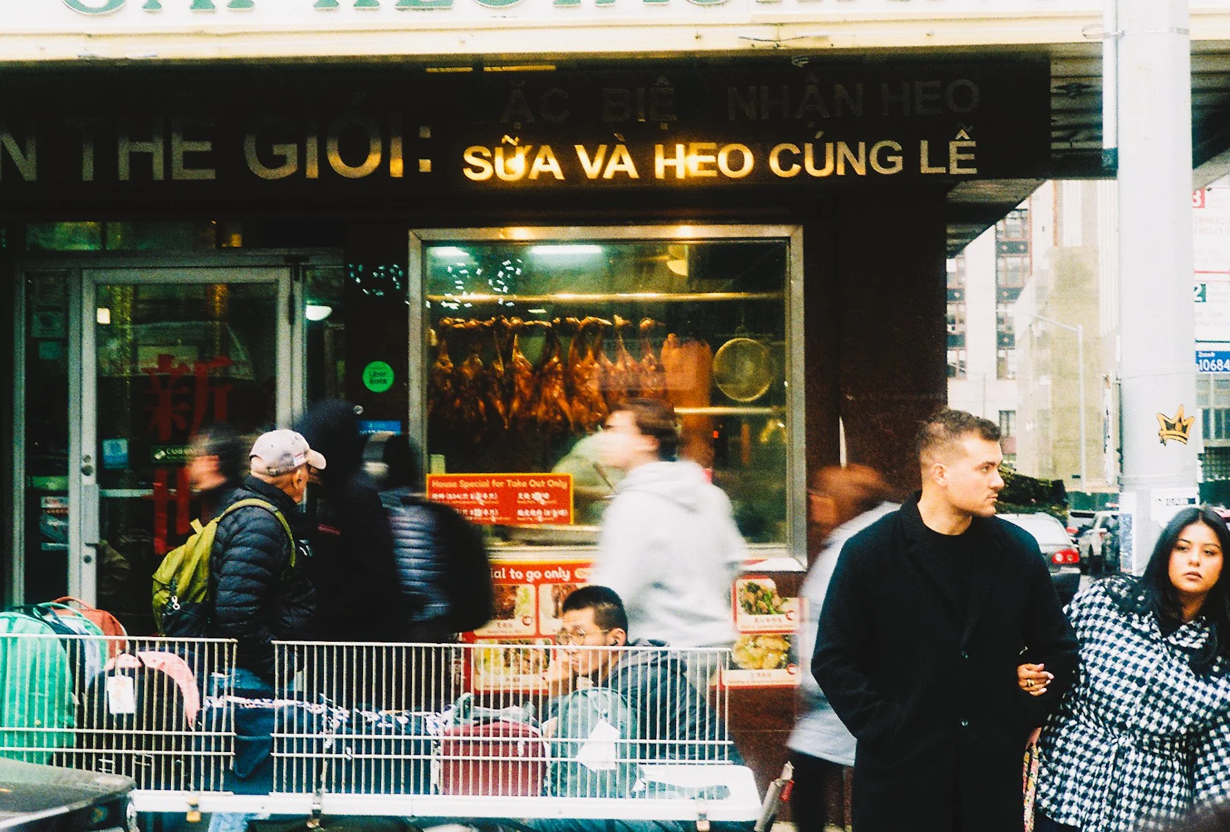 Street scene outside a Vietnamese restaurant with hanging roasted ducks in the window and several people walking past, including a young man and woman holding an arm, a person sitting with a shopping cart, and others blurred View fullsize