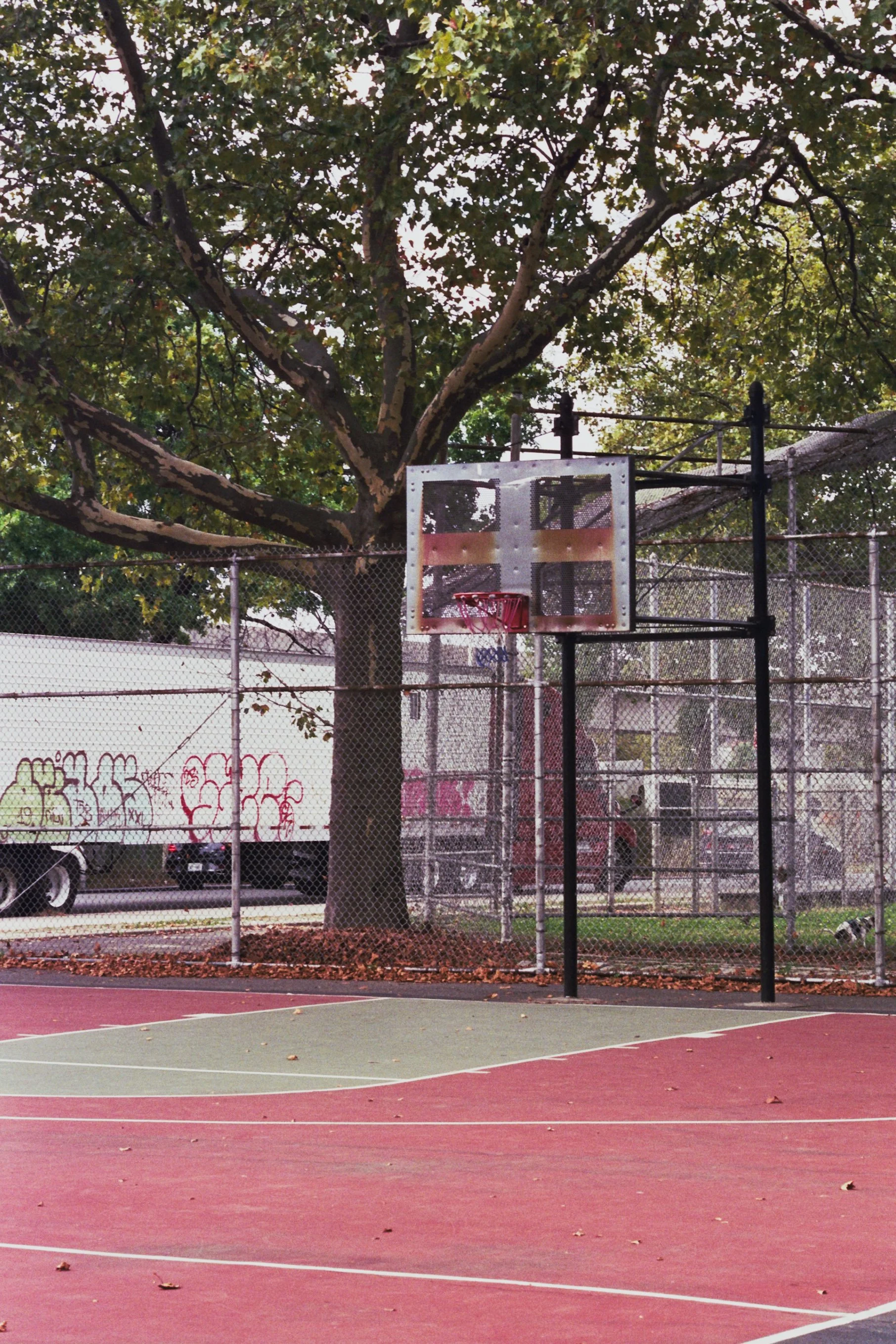 An empty outdoor basketball court surrounded by a chain-link fence with a large tree in the background. The court has red and green painted sections, and a basketball hoop attached to a backboard. View fullsize