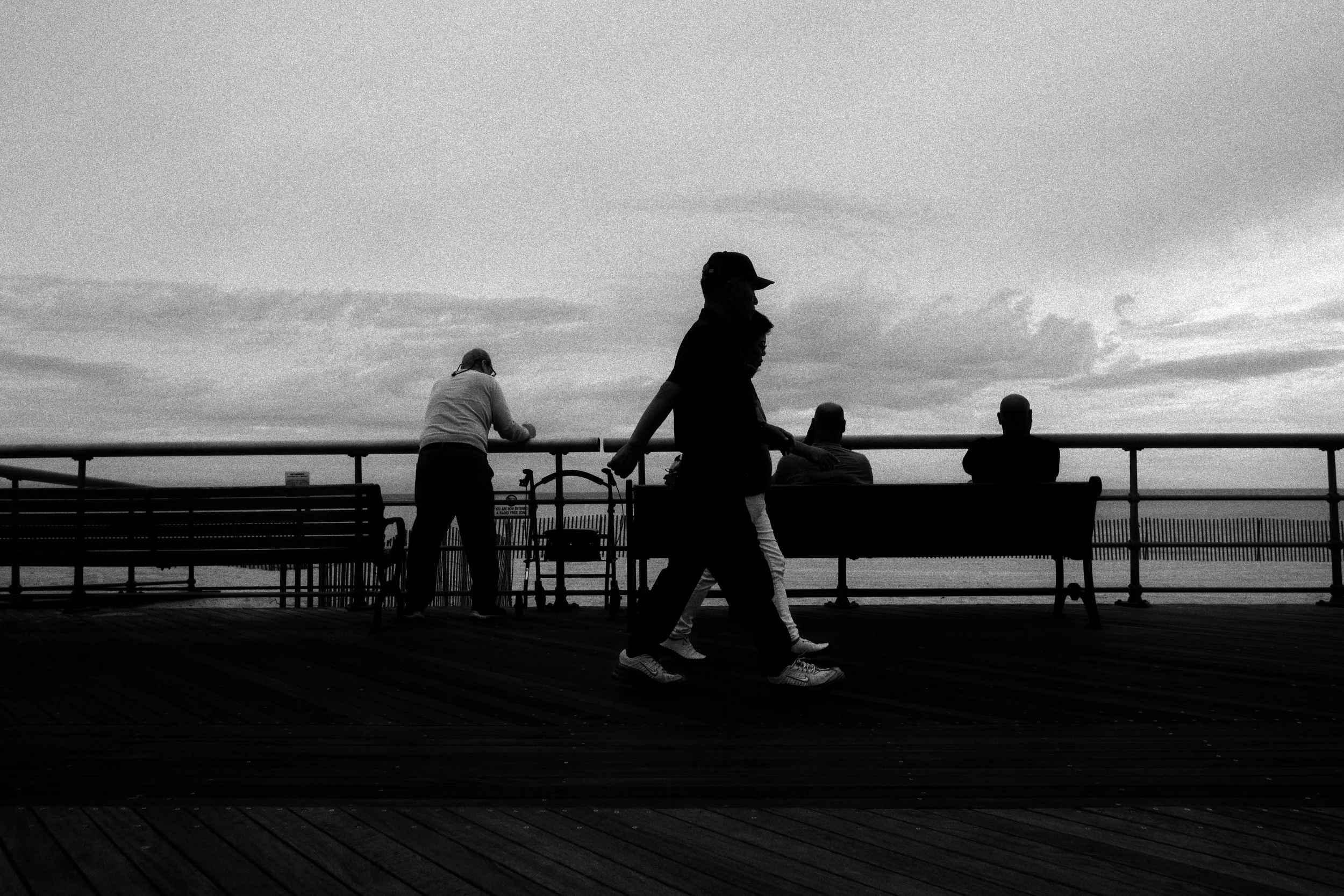 Silhouettes of four people on a pier, with a bench, railing, and cloudy sky in the background. View fullsize