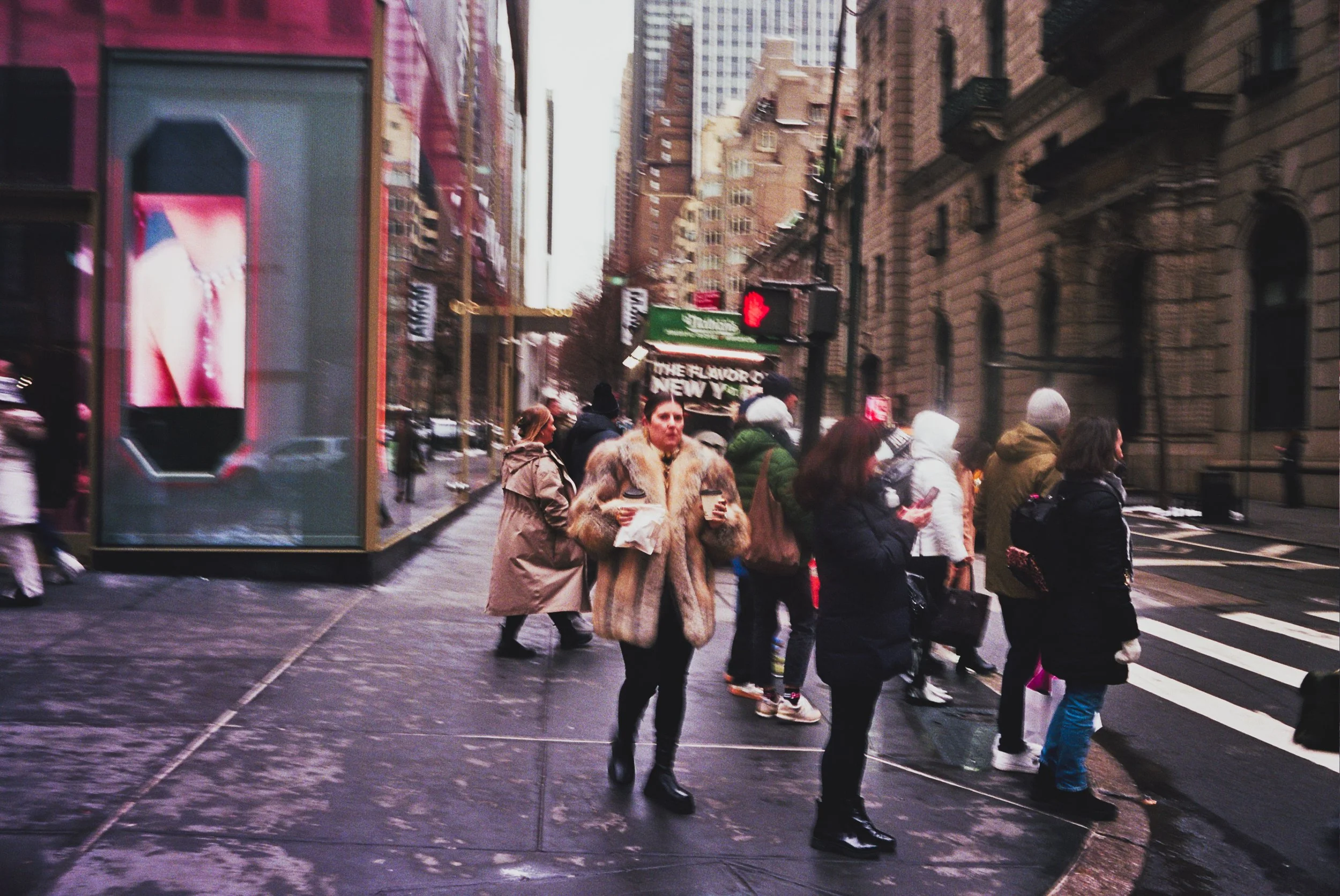 A busy city sidewalk with pedestrians, some standing and waiting to cross or walking. Tall buildings line the street, and there is a digital billboard on the left and a crosswalk in the foreground.