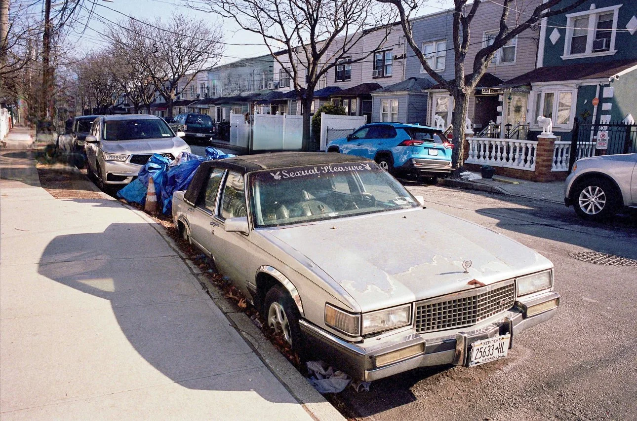 An old, weathered convertible car with a cracked and peeling paint job, parked on a residential street. The windshield has writing that says 'Sexual Pleasure.' There are several other parked cars and houses with front porches and trees lining the str
