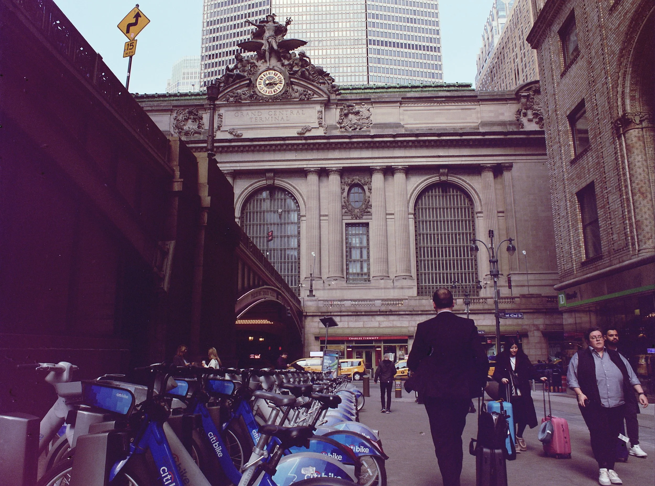 People walking near Grand Central Terminal in New York City with bike-sharing stations in the foreground and the historic building in the background. View fullsize