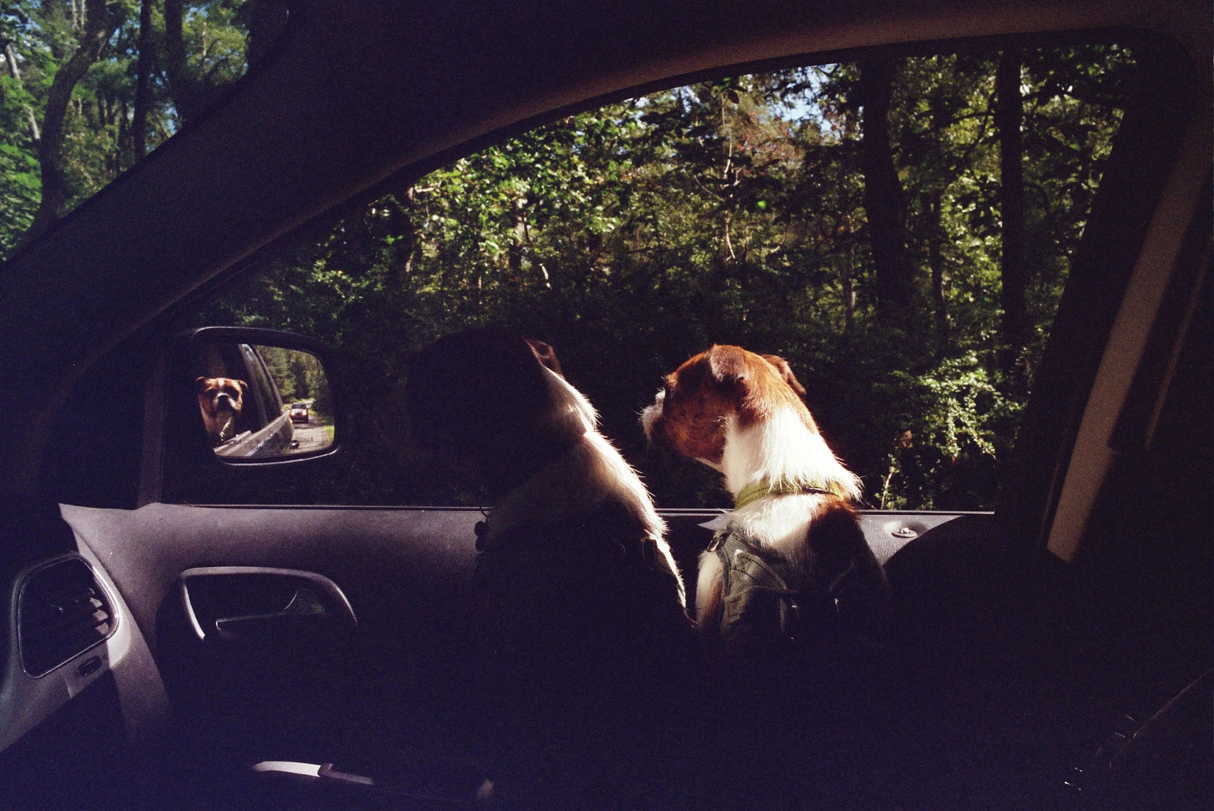 Two dogs sitting in the front seats of a car, looking at each other, with a third dog visible in the side mirror, all in a wooded area with sunlight filtering through the trees.