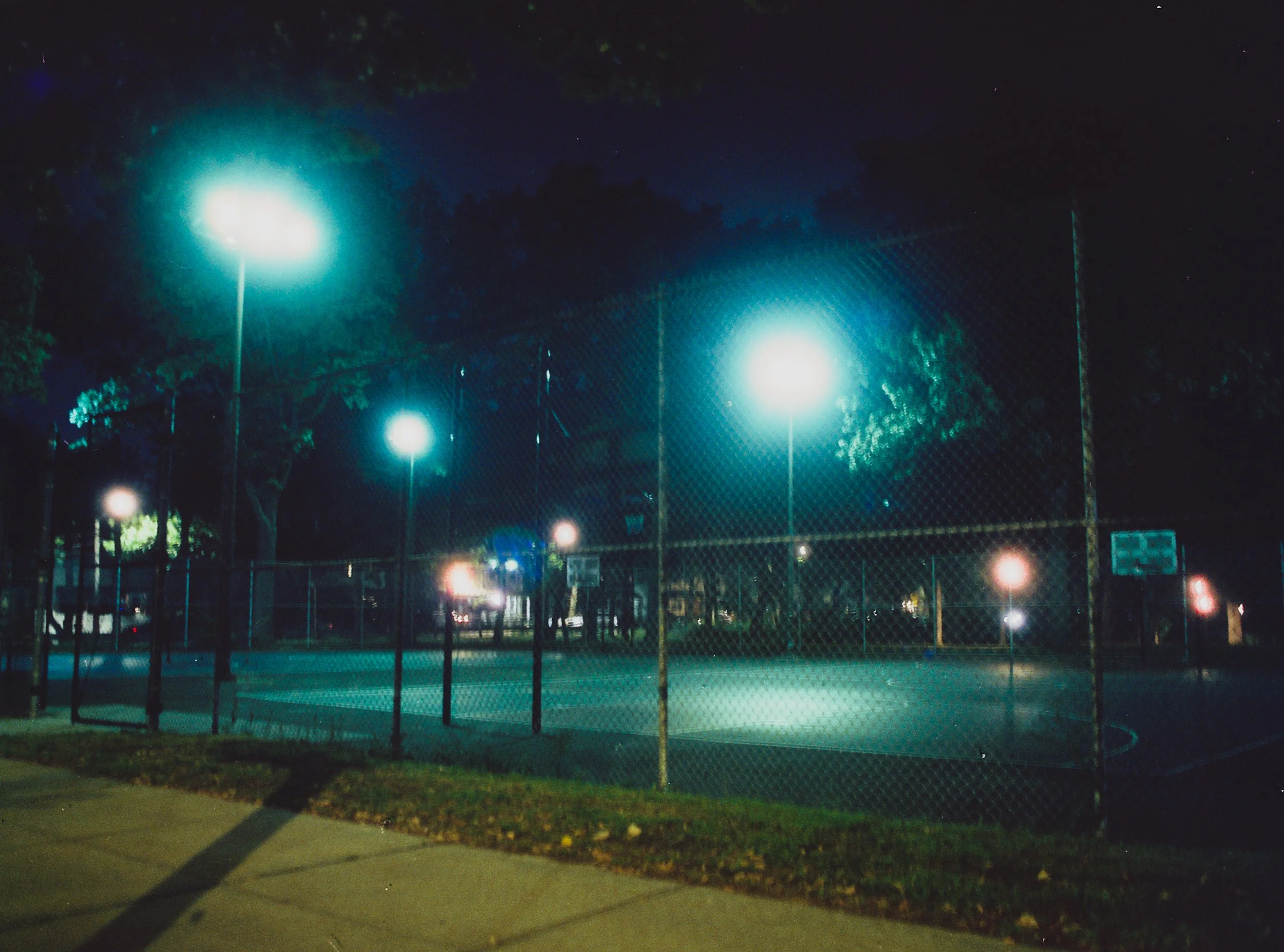 A night scene of an outdoor basketball court illuminated by bright overhead lights, surrounded by a chain-link fence and trees.
