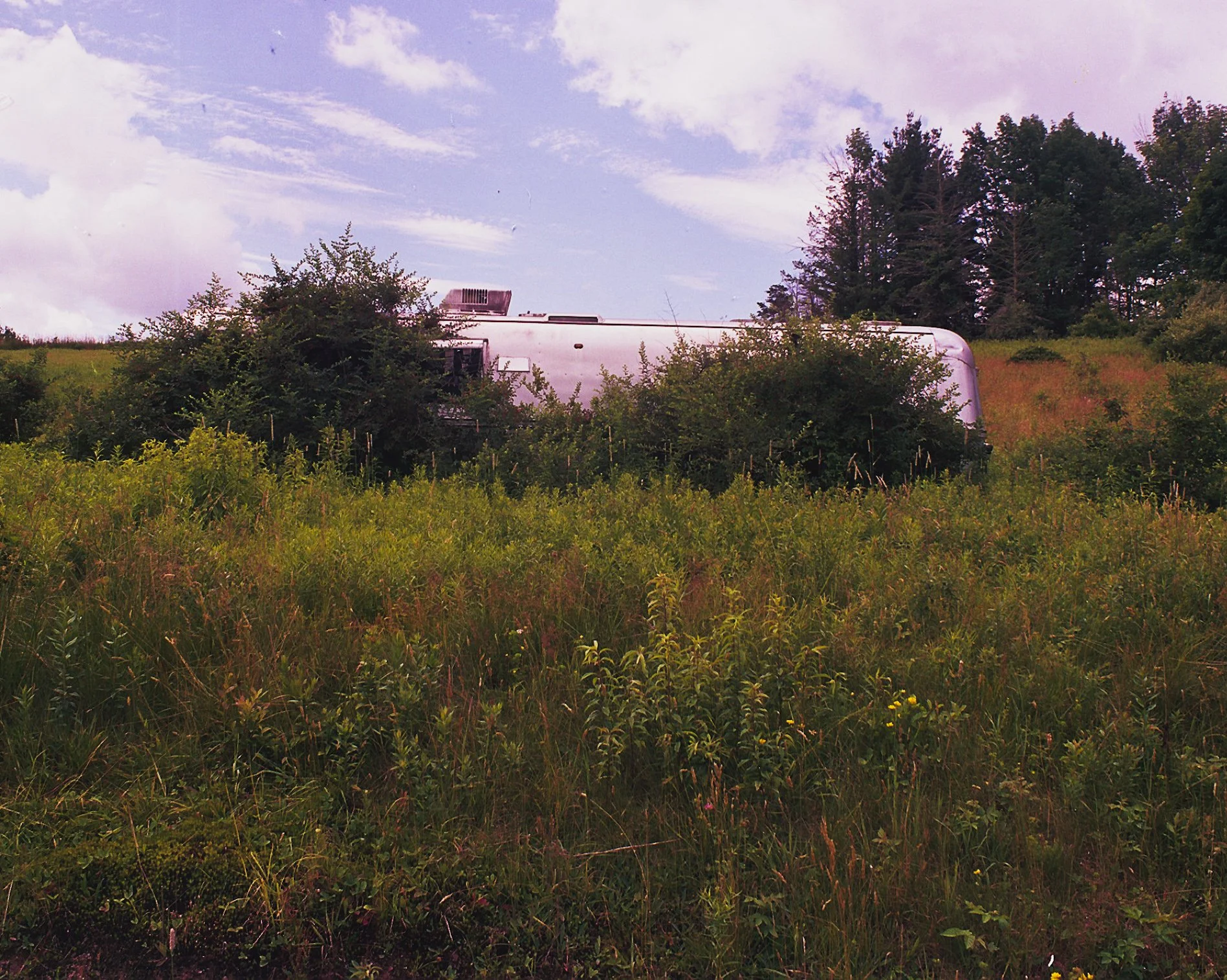 An abandoned travel trailer partially hidden among overgrown bushes and tall grass in a rural, grassy area under a partly cloudy sky. View fullsize