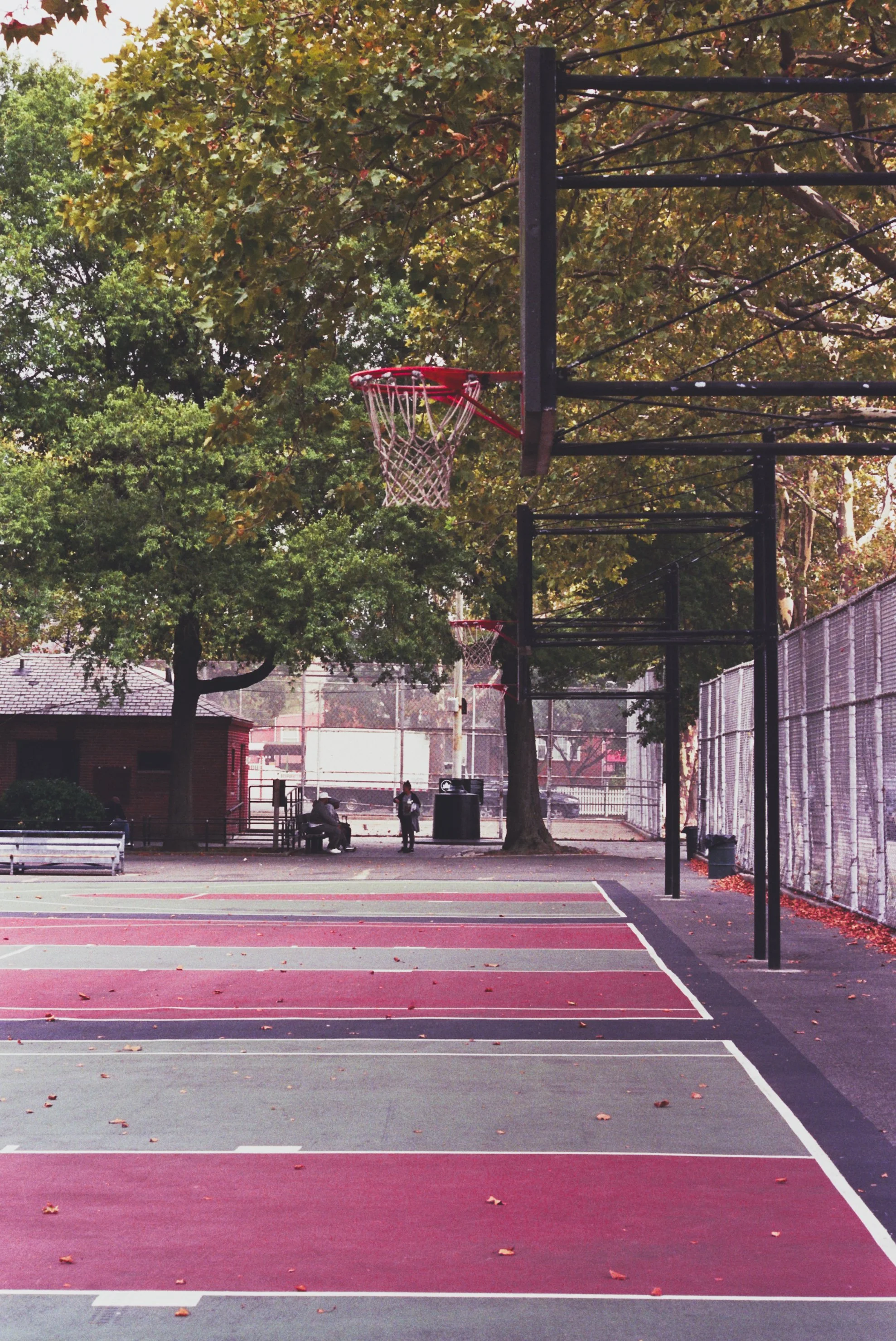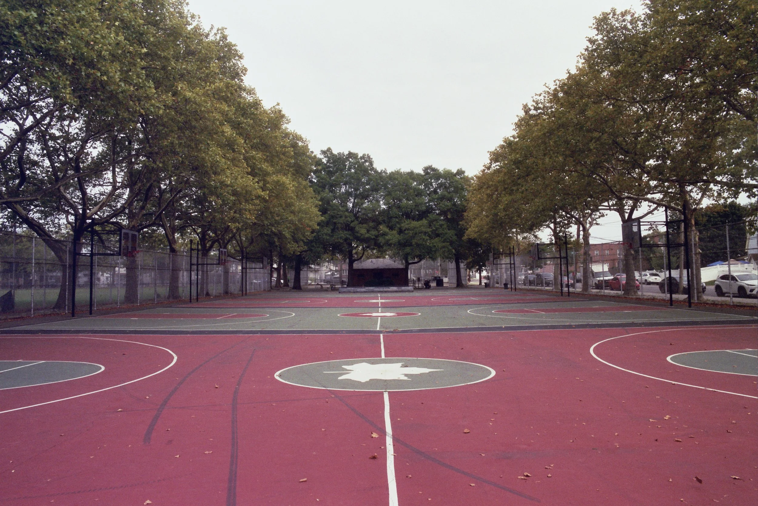 Empty outdoor basketball court with red and green surface, surrounded by tall trees and fences, with parked cars and buildings in the background. View fullsize