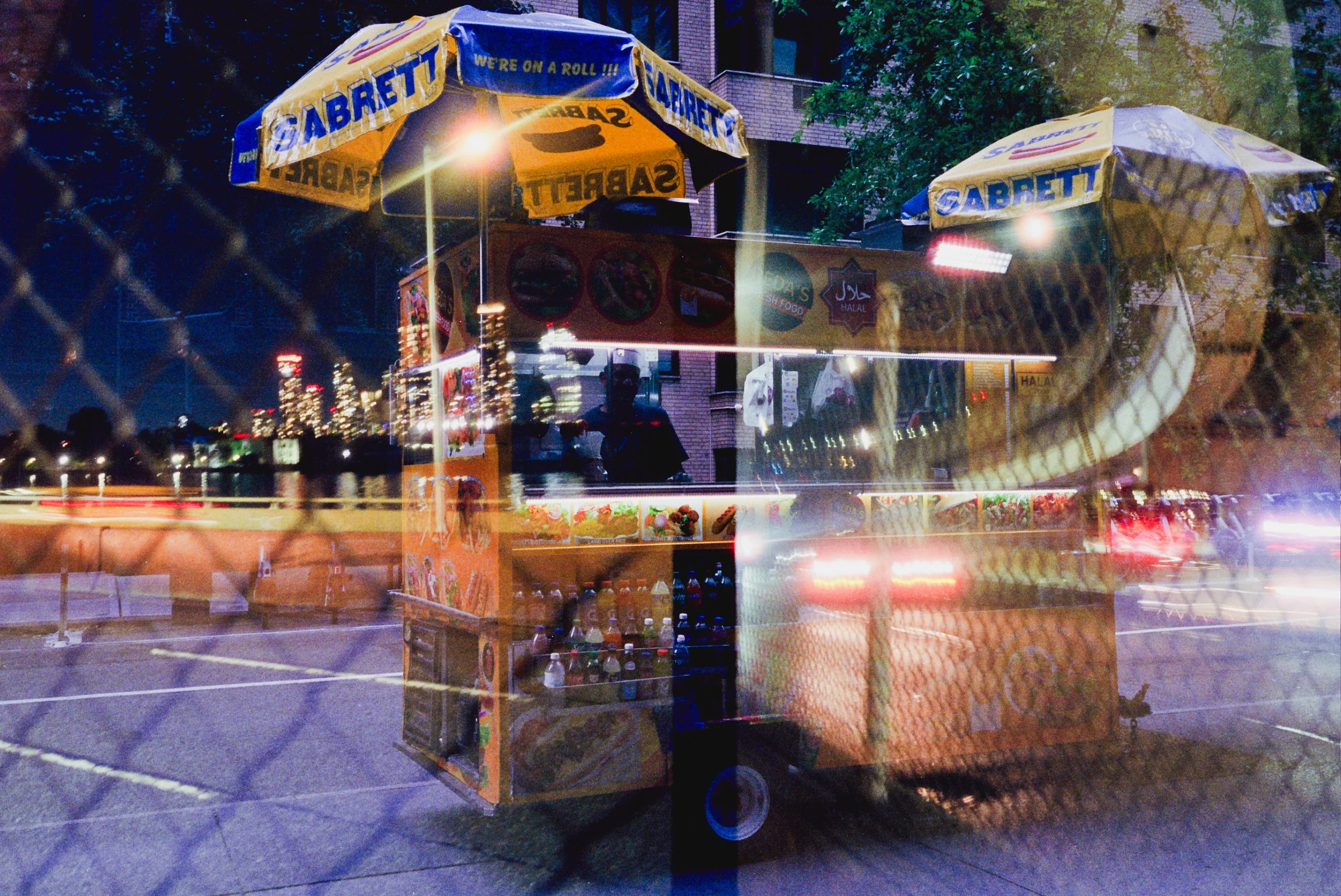 Nighttime scene of a hot dog food cart with yellow Sabrett umbrellas and a digital sign displaying 'HALAL FOOD' in red and green lights. Two people are standing in front of the cart, one in a hoodie and the other in a cap, illuminated by hanging stri View fullsize