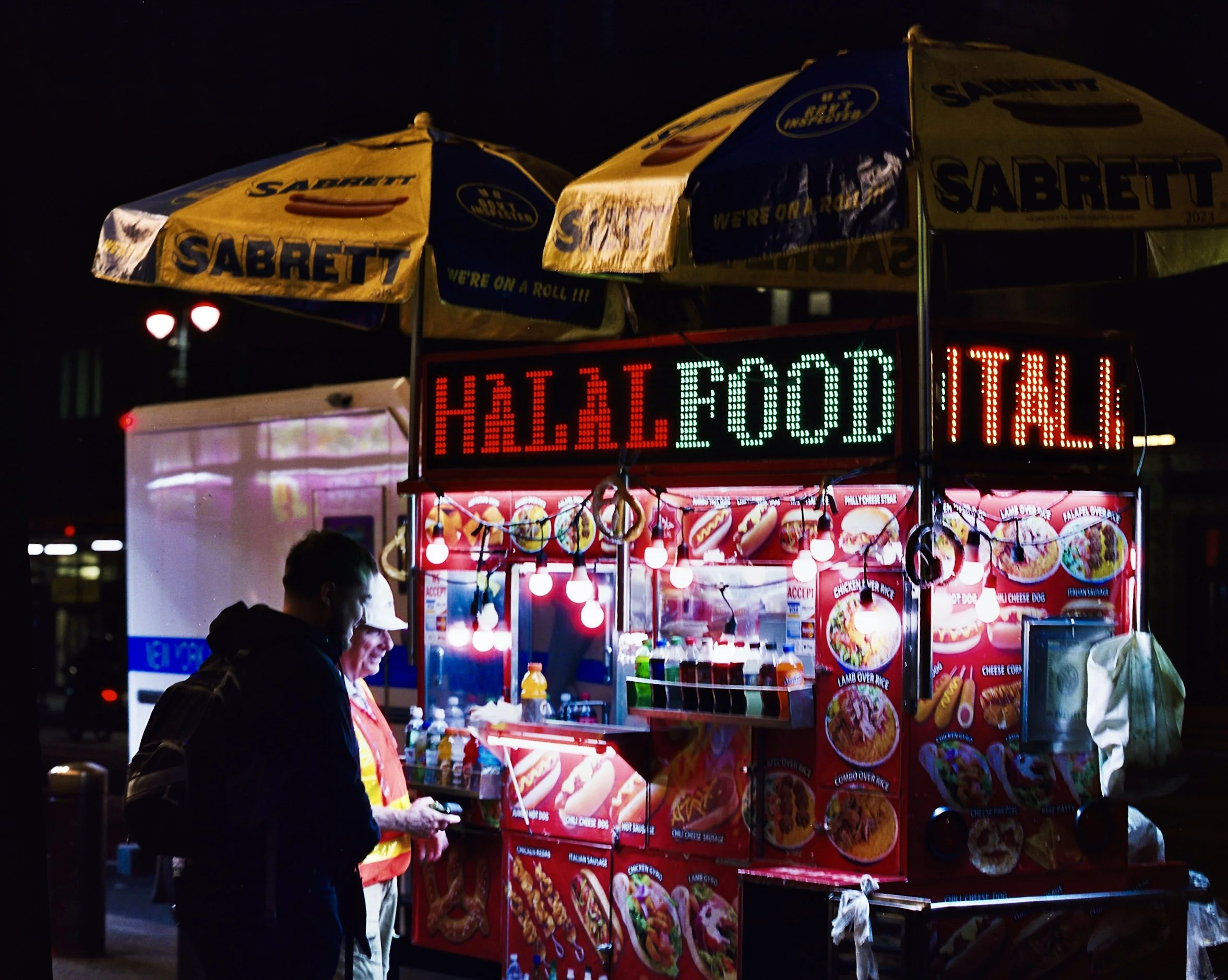 Nighttime scene of a hot dog food cart with yellow Sabrett umbrellas and a digital sign displaying 'HALAL FOOD' in red and green lights. Two people are standing in front of the cart, one in a hoodie and the other in a cap, illuminated by hanging stri
