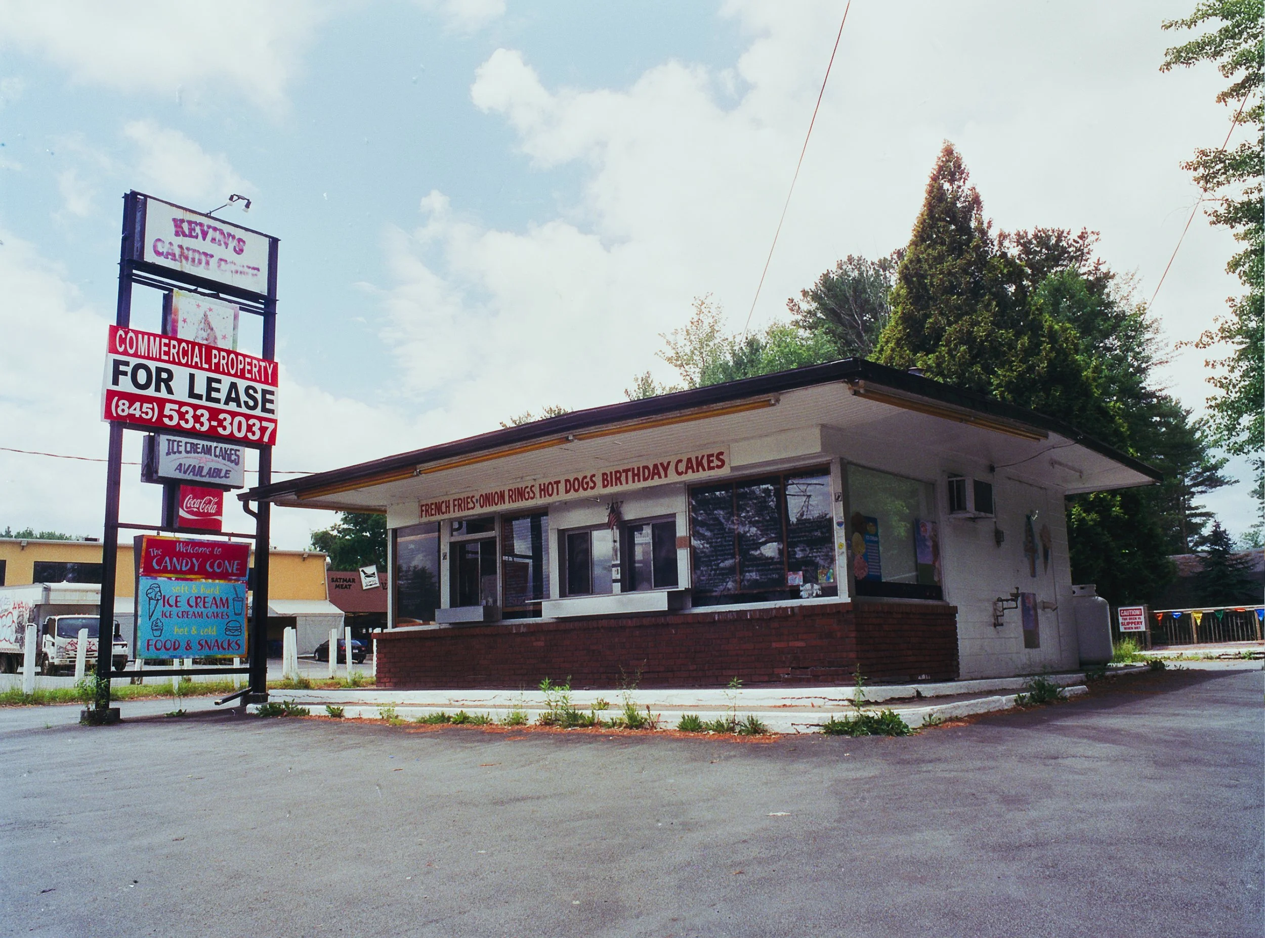 Small fast-food stand with a sign advertising French fries, onion rings, hot dogs, and birthday cakes. The stand has a brick base, large windows, and is surrounded by trees and parking lot. A tall sign outside announces a commercial property for leas