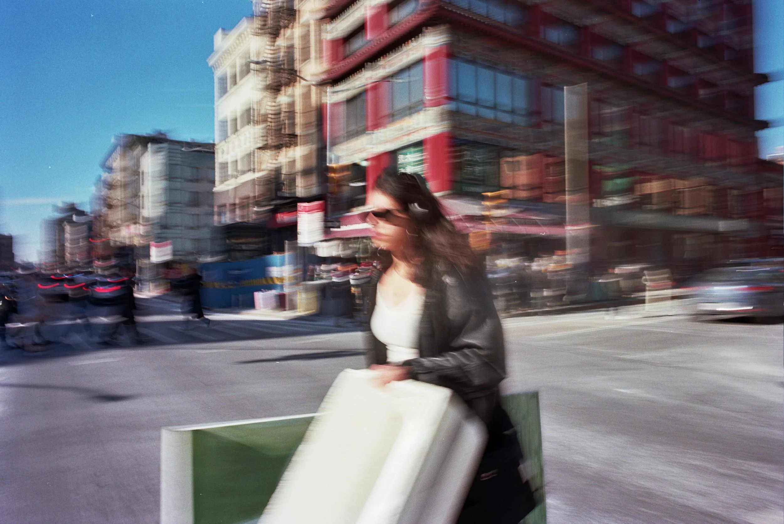 A woman with sunglasses and a black leather jacket is walking with a white and green object in her hands. The photo has a motion blur effect, with a city street and buildings in the background.