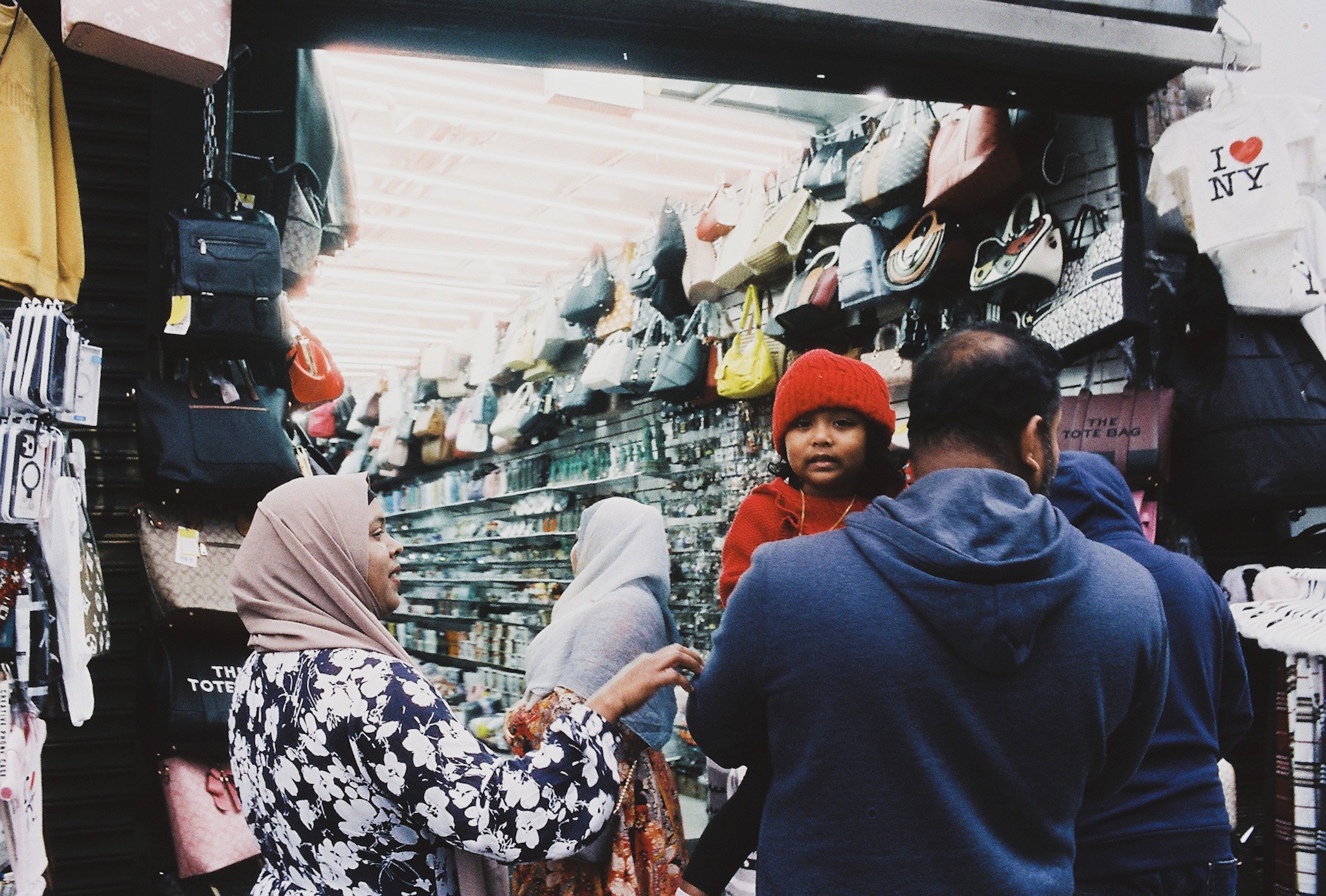 People shopping for handbags in a store with shelves filled with various purses and bags.