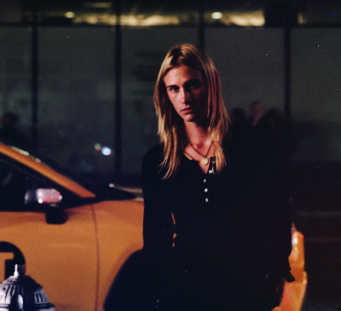 A young man with shaggy blonde hair and a young woman with straight blonde hair standing in front of a yellow taxi cab at night, with a building with glass windows and lights in the background.