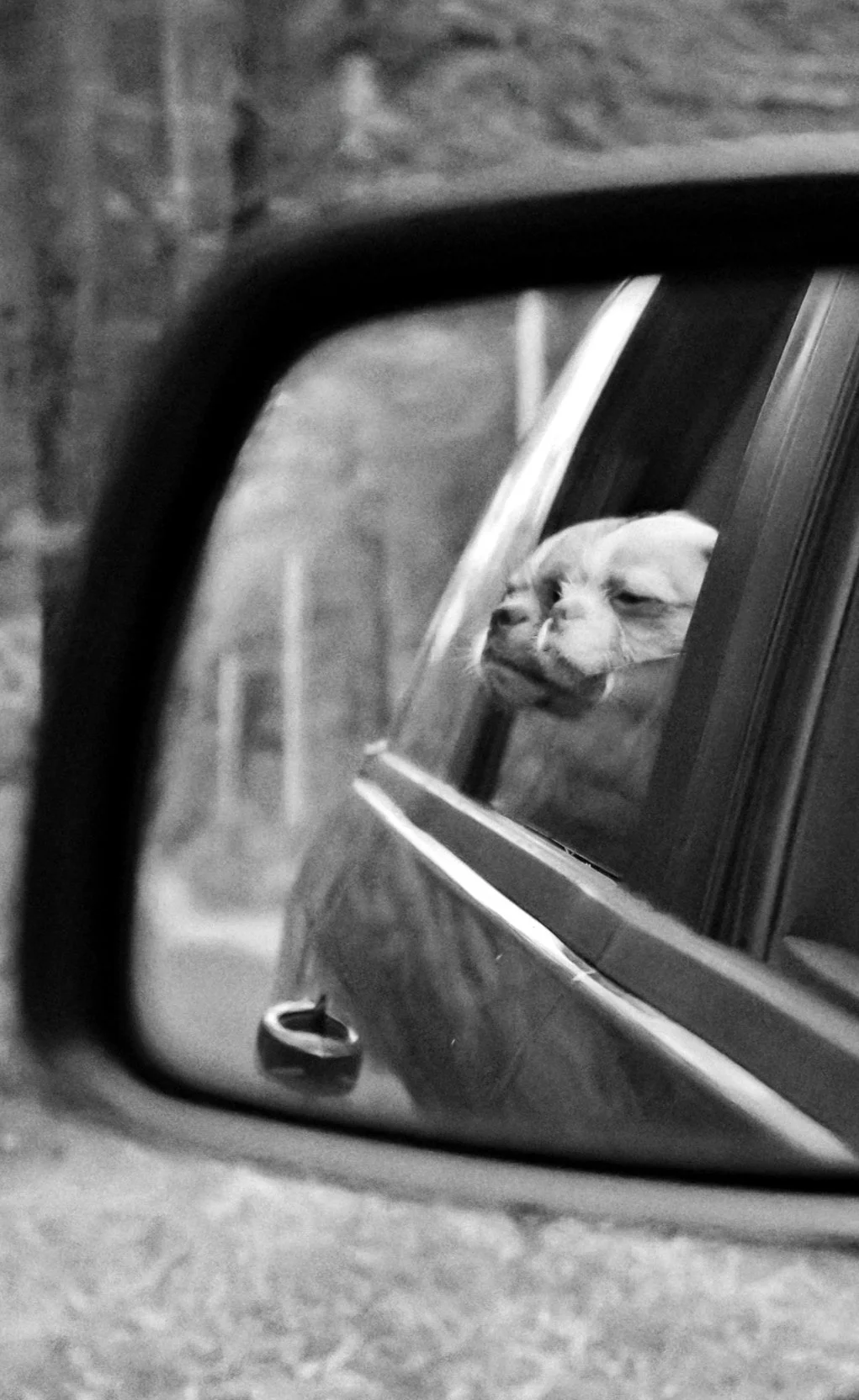 A dog with a relaxed expression sticking out its head out of a car window, seen through the side mirror. The photo is in black and white.