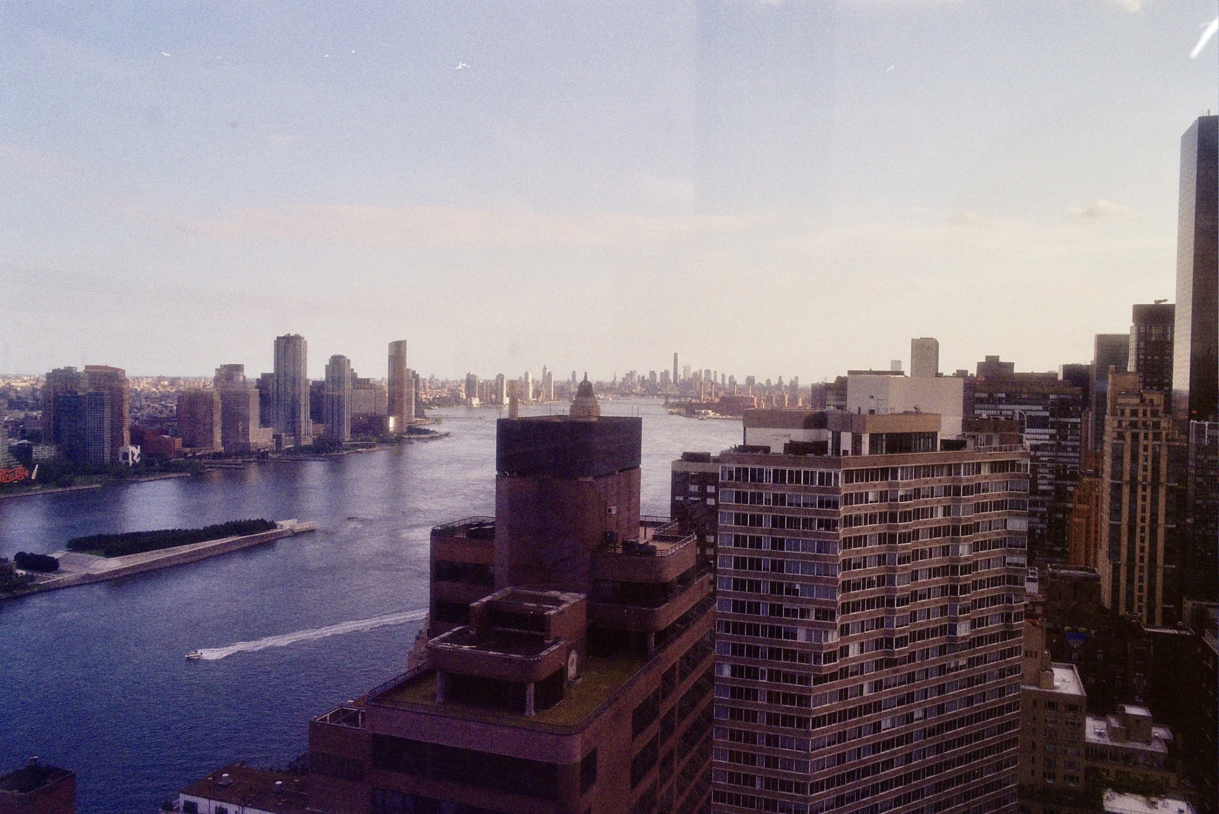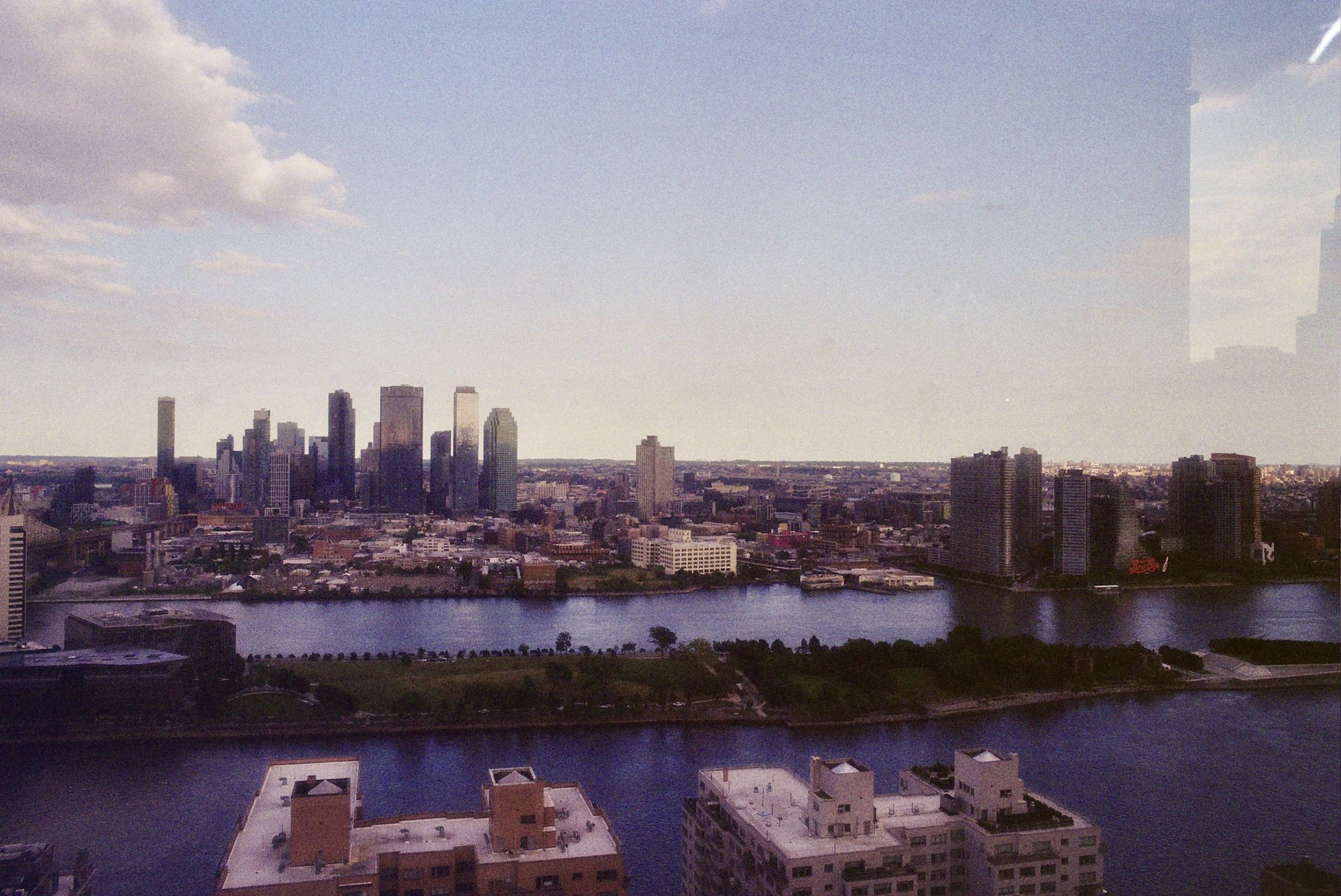 City skyline with tall buildings, river in the foreground, partly cloudy sky