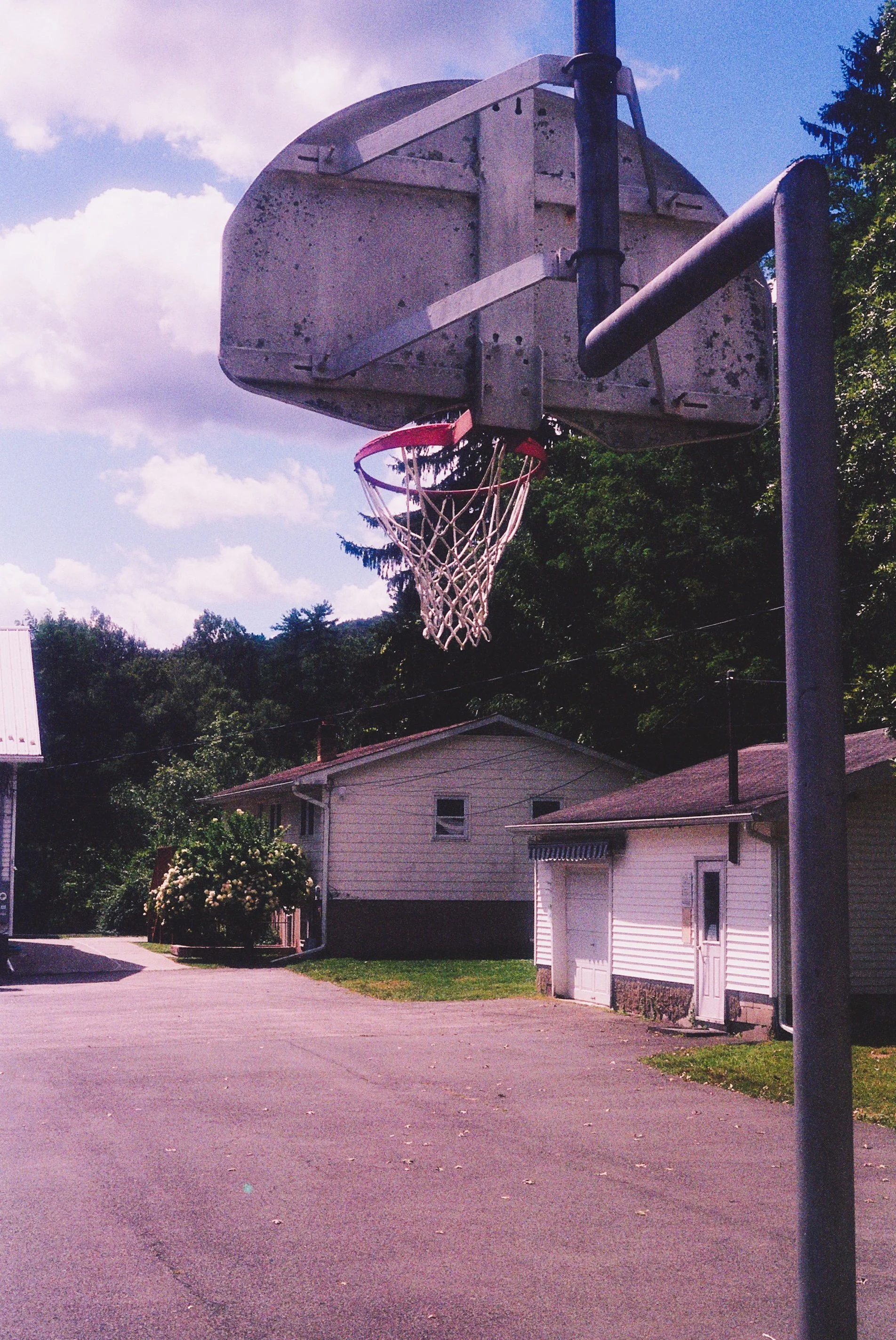 An outdoor basketball hoop with a backboard and net, mounted on a pole in a residential area with houses, trees, and a partly cloudy sky in the background. View fullsize