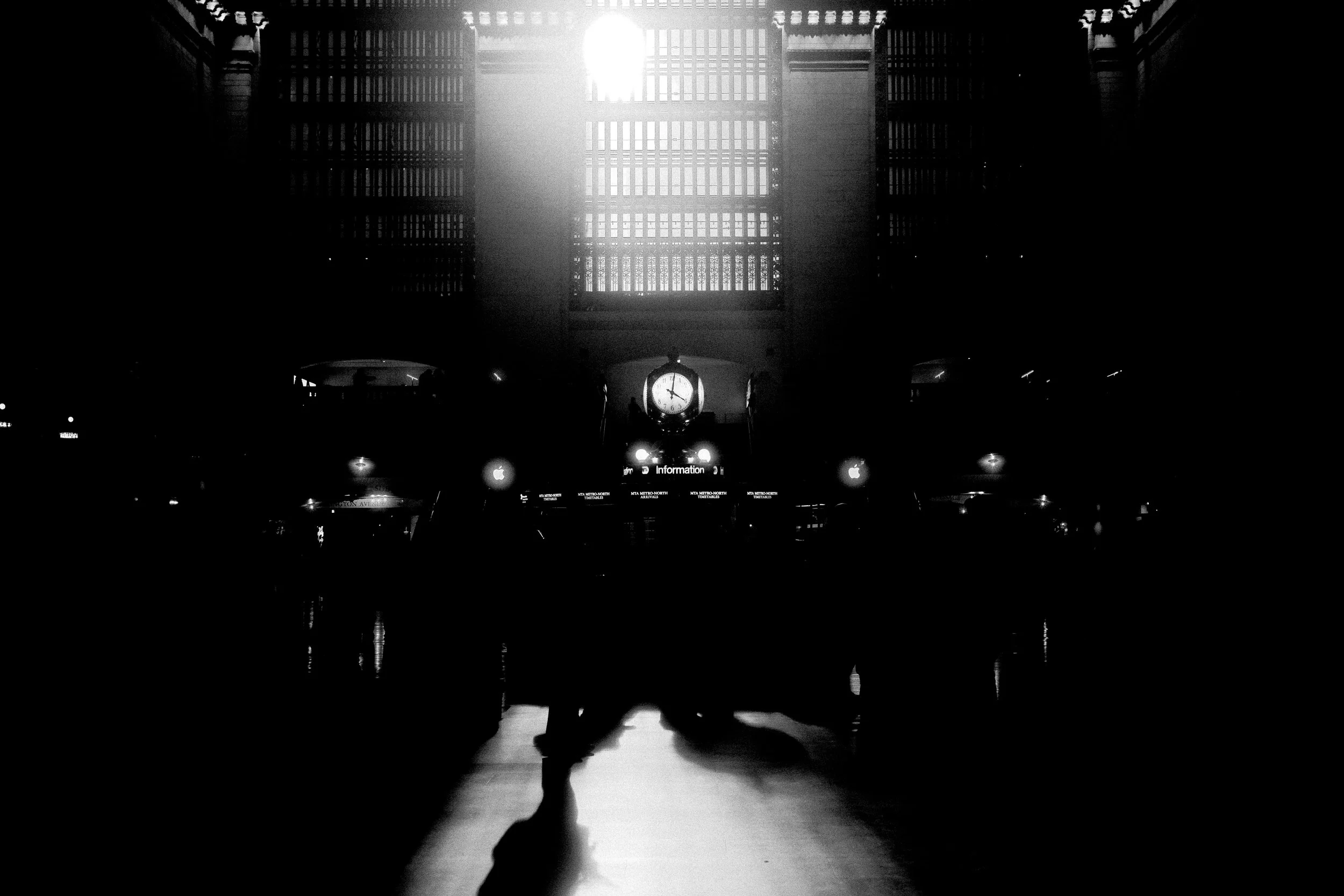 Black and white photo of a large train station with a clock on the wall, sunlight streaming through tall windows, and silhouetted people walking.