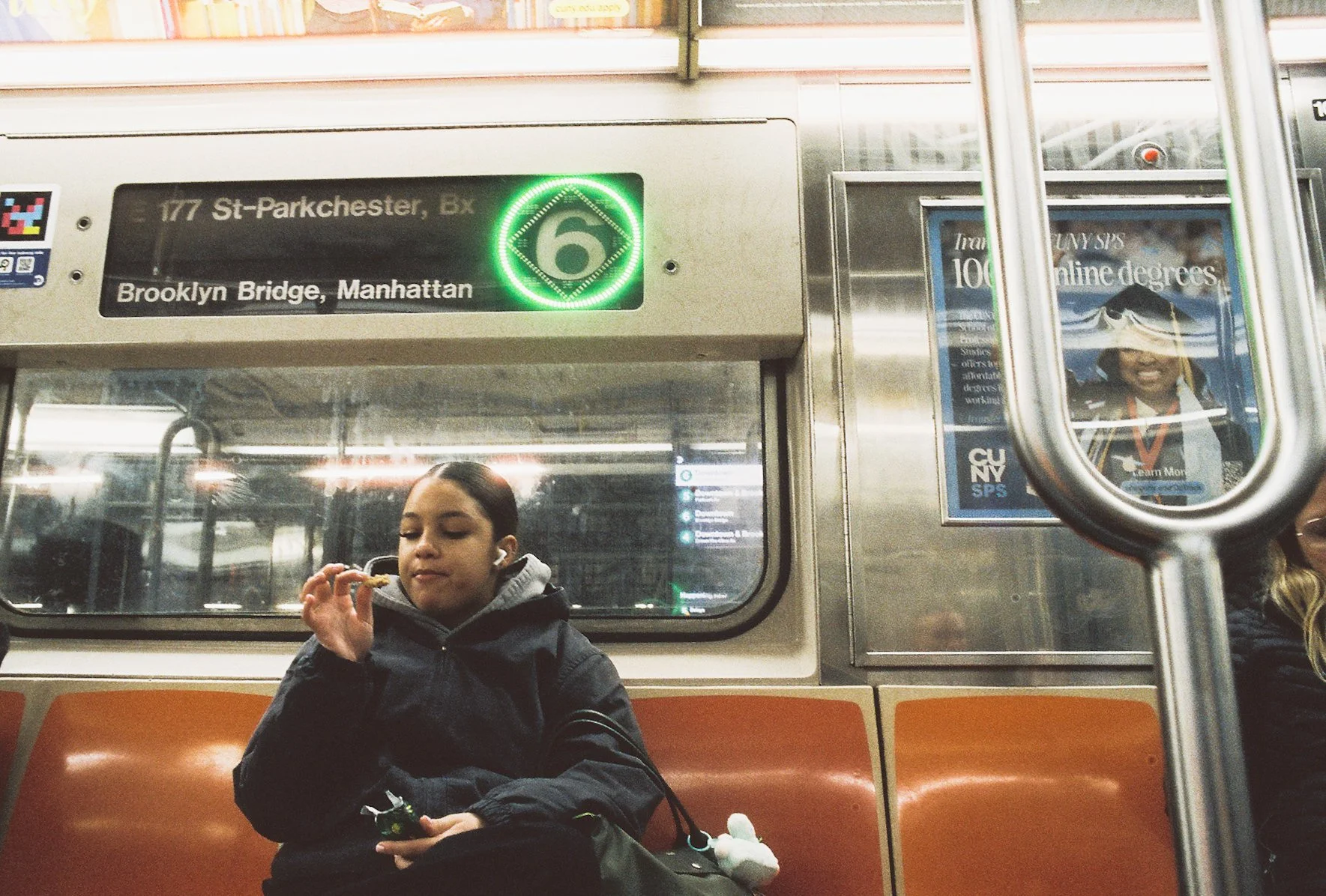 A young girl sitting on a subway seat eating a snack, wearing a black jacket, with earbuds in her ears, and a black backpack on her lap, on a train with an advertisement behind her.