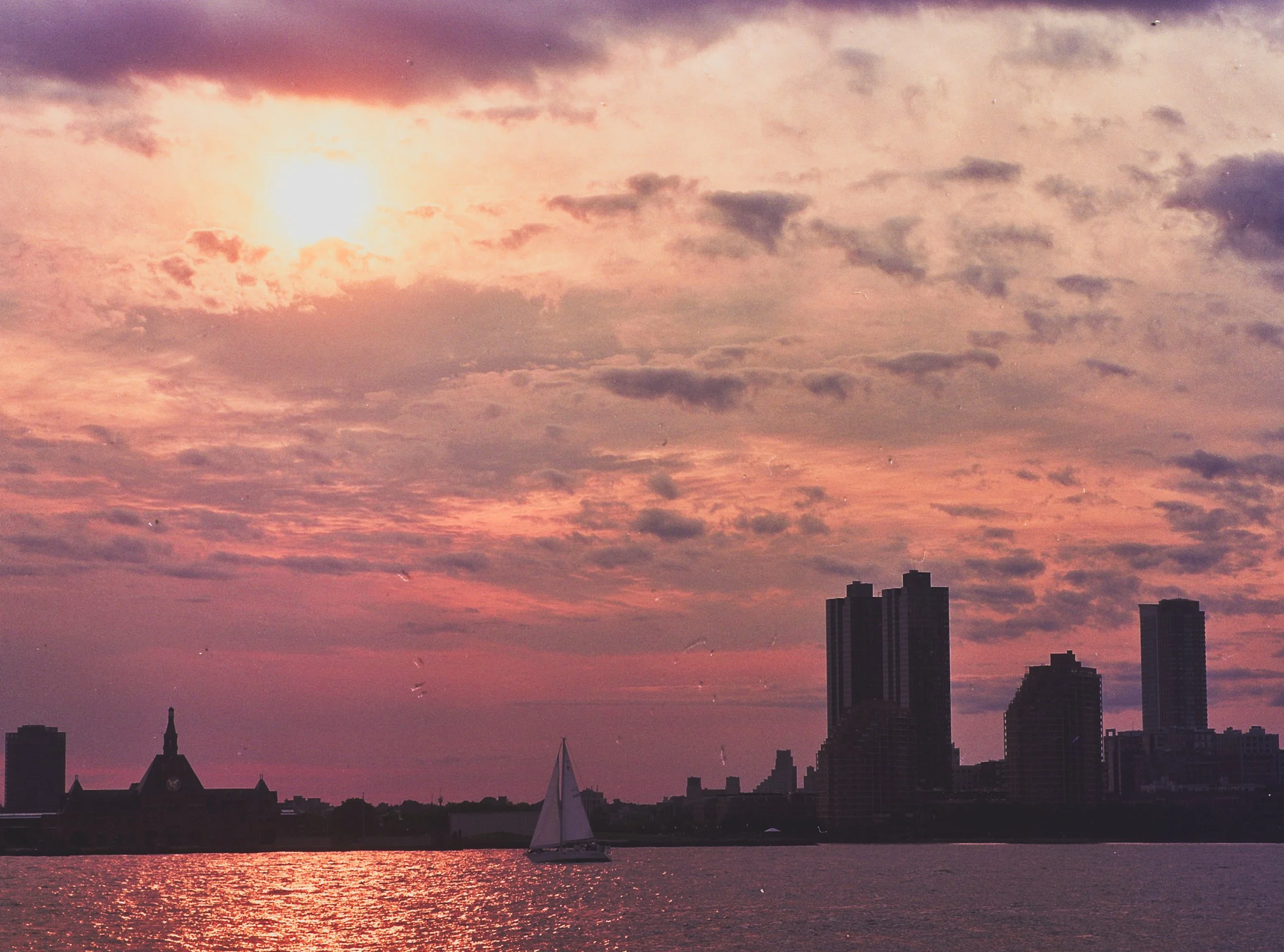 A sunset over a city skyline with a sailboat on a river or lake in the foreground. The sky is filled with pink and purple clouds, and the water reflects the colors of the sunset.