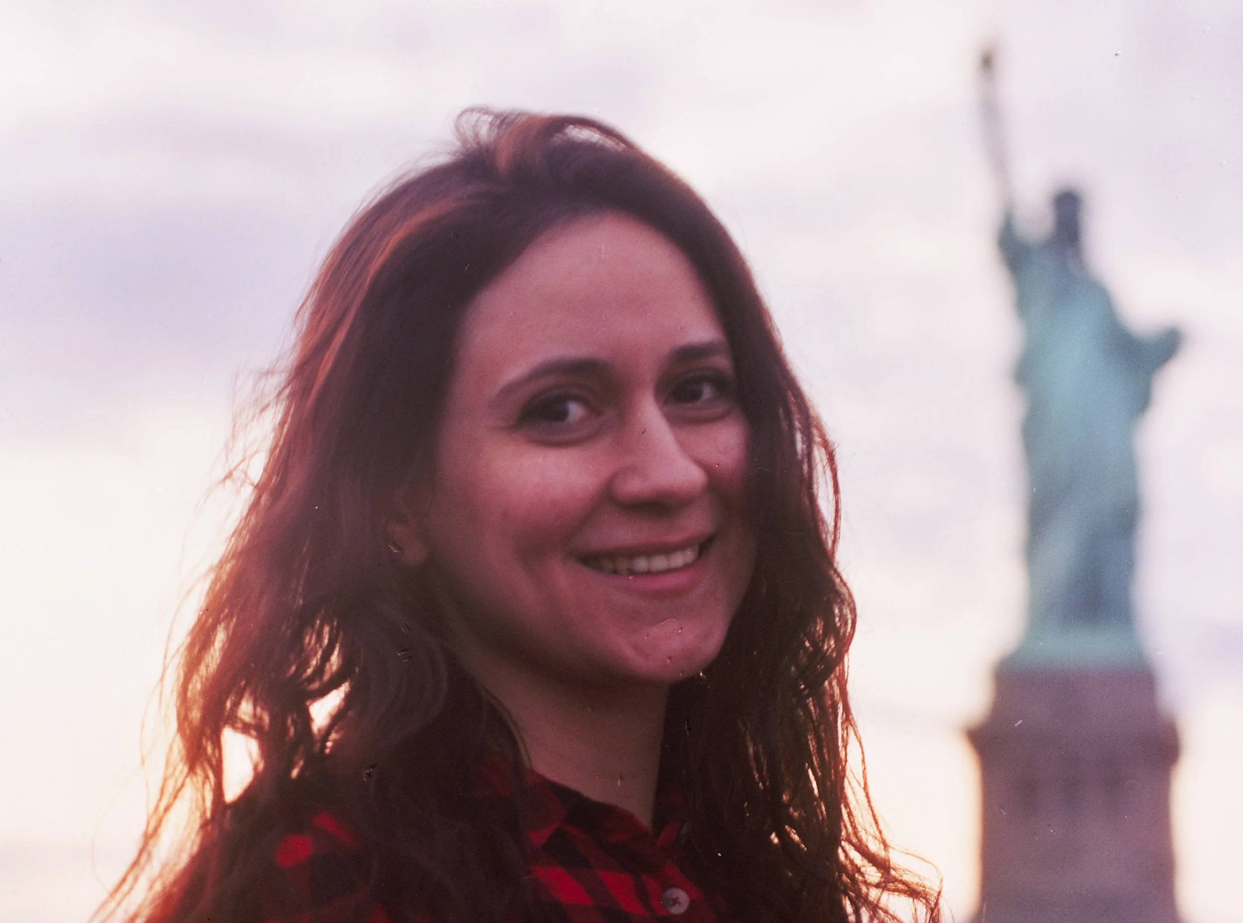 A woman with long red hair smiling in front of the Statue of Liberty in New York City. View fullsize