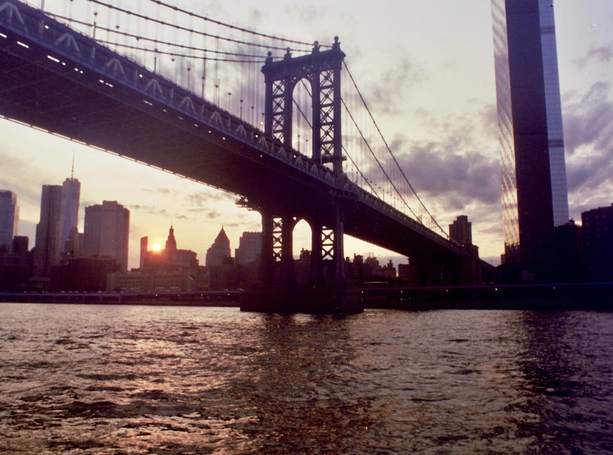 Sunset view of Manhattan skyline with the Brooklyn Bridge in the foreground, over the East River.