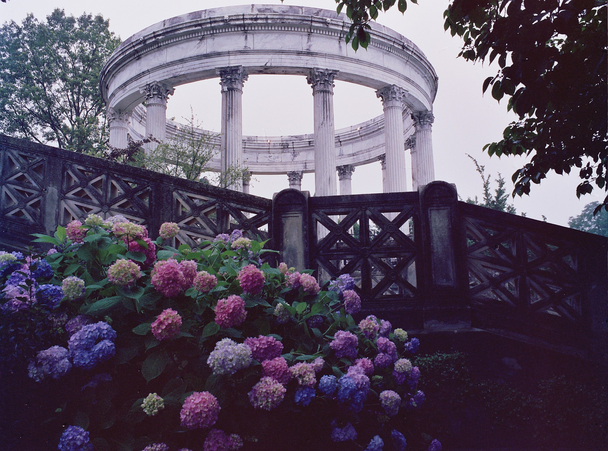 A classical architectural structure with tall white columns in a circular formation, seen from a low angle. In the foreground, there are colorful hydrangea bushes with pink, purple, and blue flowers, and a dark wooden fence with a crisscross pattern. View fullsize