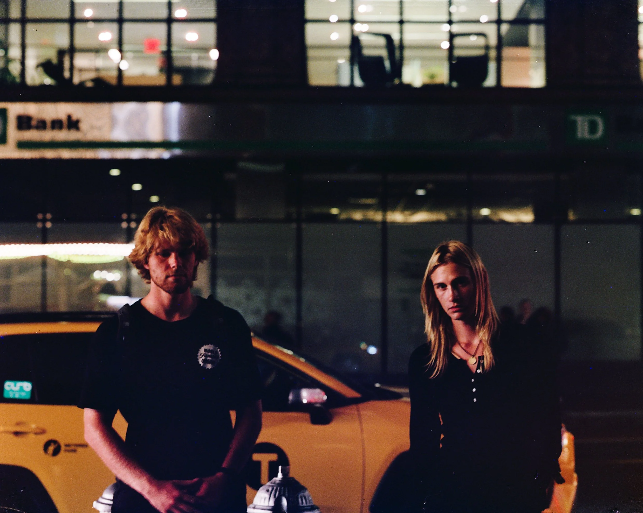 A young man with shaggy blonde hair and a young woman with straight blonde hair standing in front of a yellow taxi cab at night, with a building with glass windows and lights in the background. View fullsize