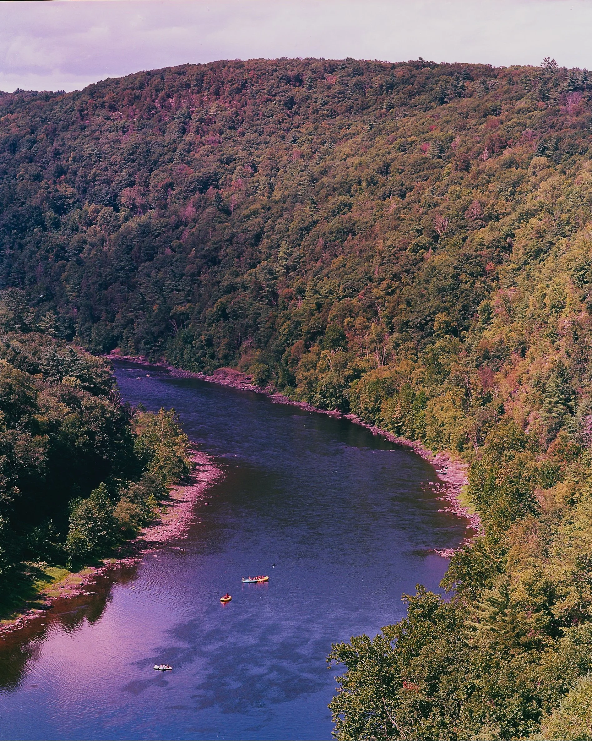 A river flowing through a forested hillside with boats floating on the water. View fullsize
