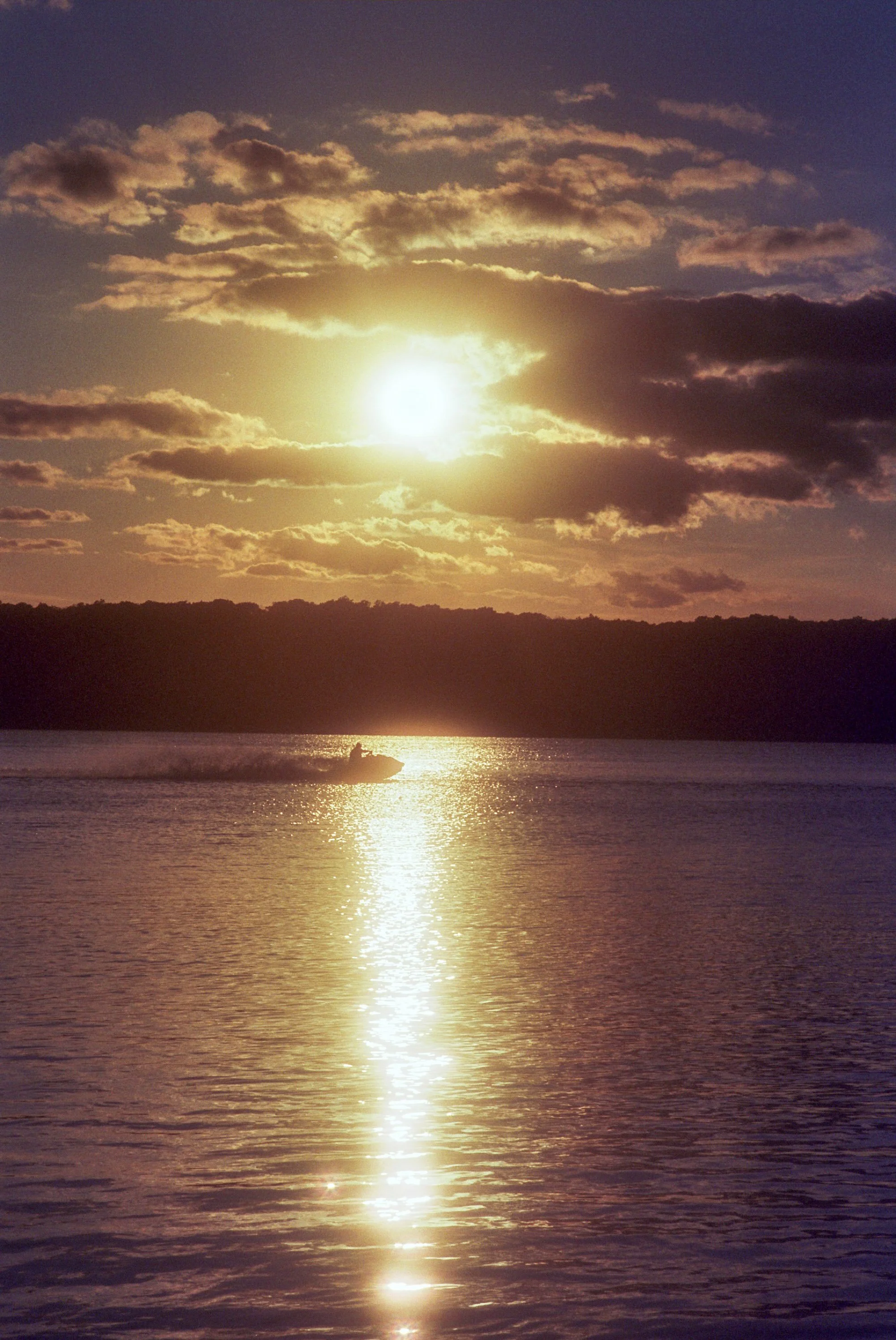 Sunset over a lake with a boat creating a wake, with clouds in the sky and a distant tree-lined shoreline.