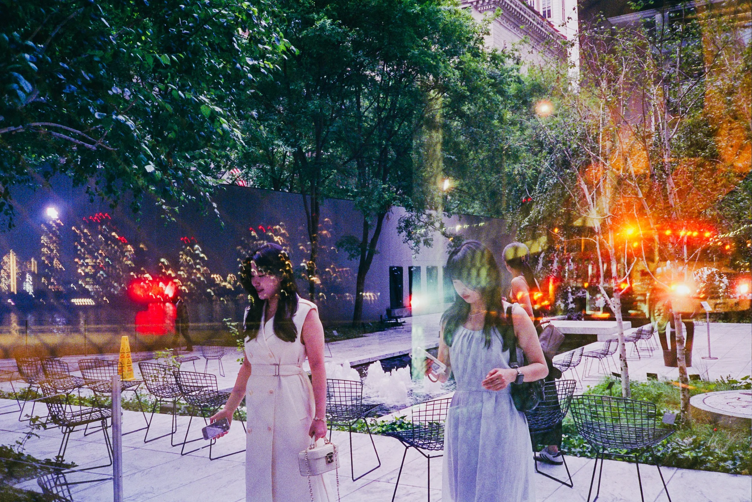 Three women standing outdoors at night, surrounded by trees and city lights, with empty chairs and a fountain nearby. View fullsize